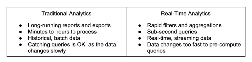 Real-time analytics are characterized by two fundamental qualities: up-to-date data and rapid insights. They are employed in time-sensitive applications where the speed at which new events are transformed into actionable insights is a matter of seconds.