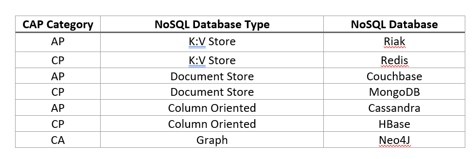 As per CAP theorem, we must choose from CA, AP or CP characteristics for a given system. This offers a way to categorize databases and provides guidance on determining which database shall be a good fit for your application.