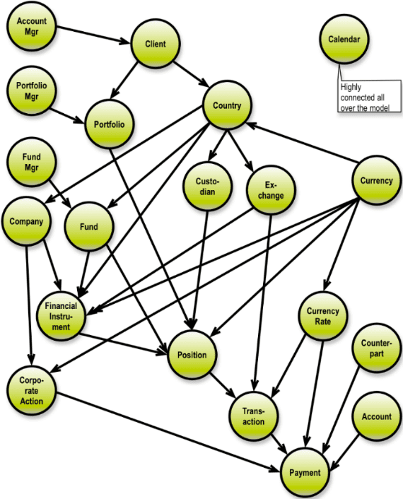 A graph database would be better at figuring out how hundreds of different member characteristics relate in several different ways to disseminate retirement information. A graph database, like any ontology, depicts behaviors of entities and the relationships between them. Graph databases show connections, and the specific data values mean less. Each entity, (a business, person, or object) appears as a node. Each node is connected to another by an “edge,” a connection representing a relationship between two nodes. Each node also contains characteristics or properties that are represented as “key-value pairs.” As data is added or modified, the graph database adapts and updates this information in real-time. The example below shows asset management dependencies and business complexities in an account, portfolio, or fund manager.