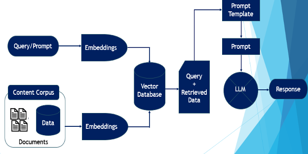 One potential solution that addresses these two problems is the RAG (retrieval augmented generation) solution. Developed by researchers from Meta/Facebook, RAG provides more accurate and context-sensitive responses. RAG is basically for leveraging LLM on the company’s own content or data. RAG is the retrieval of relevant content to augment the context or insights as part of the generation process. RAG basically integrates information retrieval from a dedicated/custom and accurate knowledge base, reducing the risk of LLMs offering general or incorrect responses. The RAG architecture is shown below.