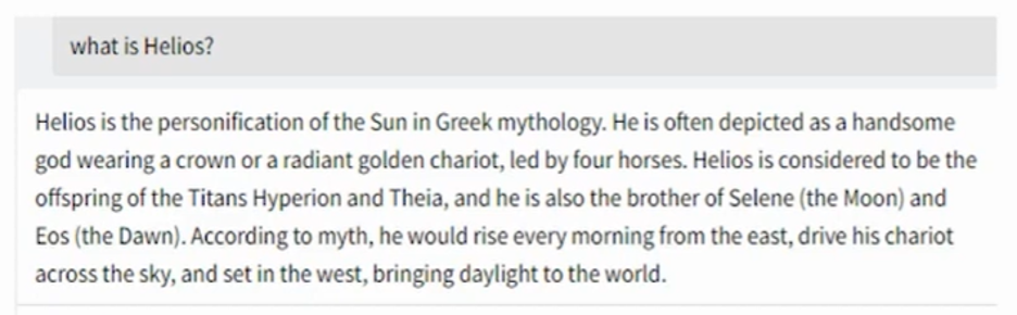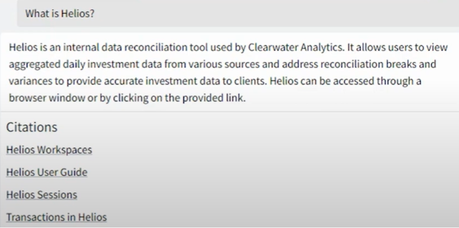 But in Clearwater’s context, Helios is one of their products for the investment management industry. So, when the knowledge corpus or Clearwater is enabled with RAG, the same question gets a different response, as shown below, along with the citations. Citations give explainability [3].