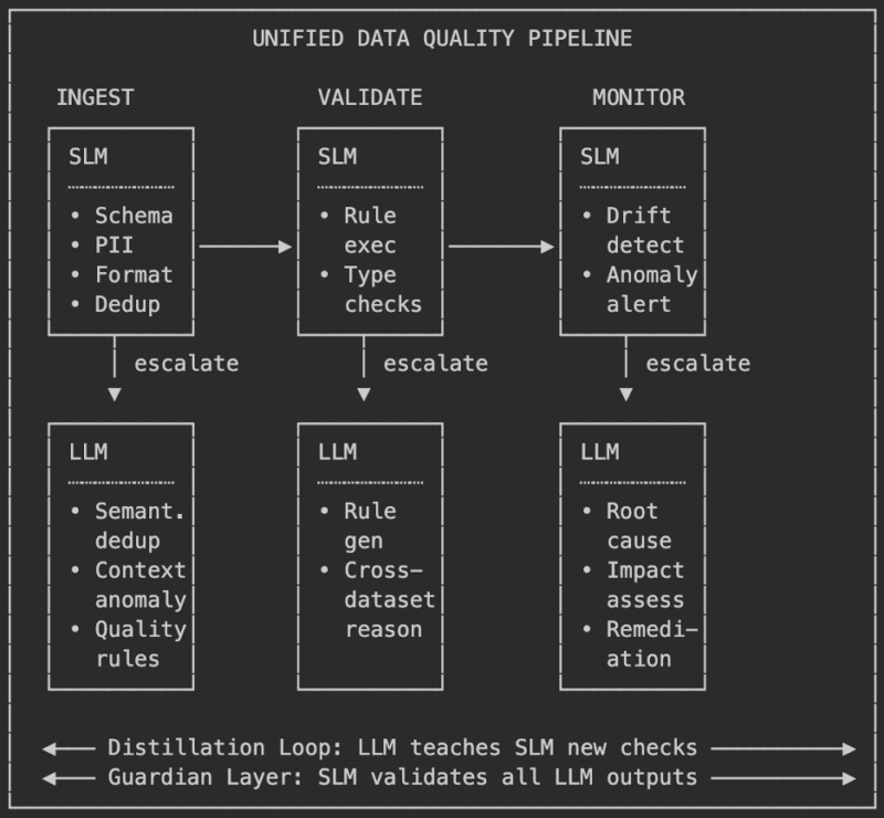 An SLM handles high-volume, routine quality checks like schema validation, null detection, type enforcement, exact-match deduplication, format compliance. These are roughly 80% of all checks and run at 10-30x lower cost than an LLM. When the SLM hits something it cannot resolve, say a semantic near-duplicate or a cross-dataset consistency question, it escalates to the LLM. Hard cases get the expensive model. Everything else gets handled fast and cheap.