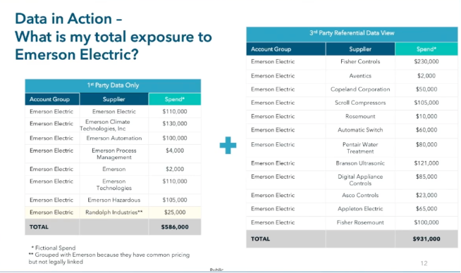 Cooper advised focusing on data quality – e.g., through reference data – rather than technology. In the figure below, a company has data about a client, Emerson Electric, as shown on the left. The tabular data on the right represents the third-party reference data and a single source of truth provided to the company on the left, which rolls up Emerson Electric’s different legal entities.