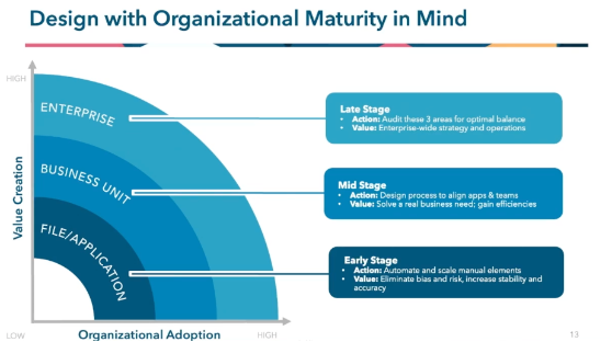 In addition to talking with stakeholders and focusing on data quality, Cooper suggested designing any MDM program with organizational maturity in mind. She went on to a slide that divided maturity into early, mid-, and late stages and then discussed value creation.