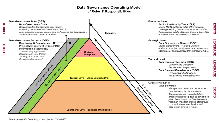 Over the years, the Non-Invasive Data Governance Operating Model of Roles and Responsibilities (pyramid diagram above) has not changed a lot. The model is still made up of the same levels and sidebars. the names and descriptions of the roles and responsibilities continue to be adjusted depending on organizational culture and the need for governance of data.