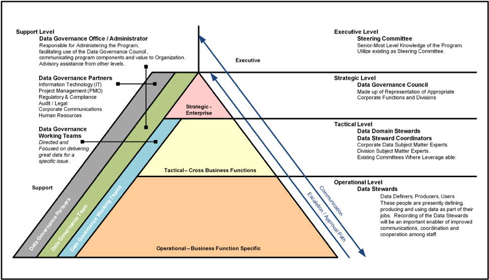 When this “volunteer” scenario becomes the case, data issues tend to escalate to the strategic level with more regularity. Note the arrows along the right side of the pyramid. One arrow represents a decision-making escalation path from the operational (business function) to strategic (enterprise) authority. The outer arrow represents the need for effective communications at, and between, all levels and roles of the operating model.