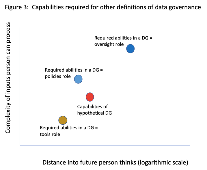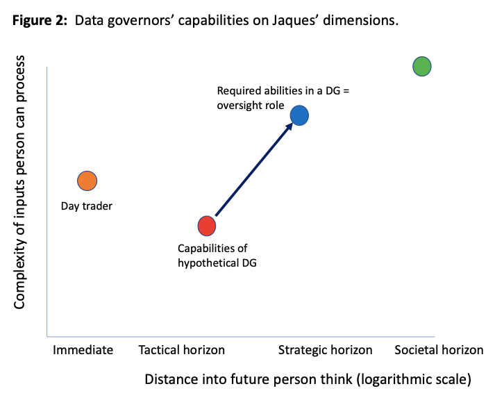 Also featured in figure 2 is the level of a hypothetical data governor on Jaques’ dimensions and a blue arrow indicating the gap between required and actual capabilities.