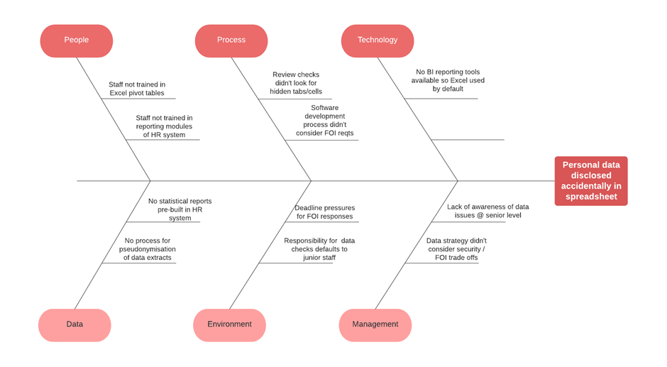 That last question gets us into talking about the data architecture of the organisation as well as the culture, training, and awareness of data issues and data-related risk in the organisation. It also has the effect of putting the discussion for why something went wrong back into the domain of senior leadership and management of the organisation (where W.Edwards Deming tells us the bulk of the root cause for defects and error should lie). It can be useful to visualise this type of analysis with a Fishbone Diagram to see how things might relate or which area of the potential problem and solution space it may be best to focus on as you start to tackle the wicked problem.