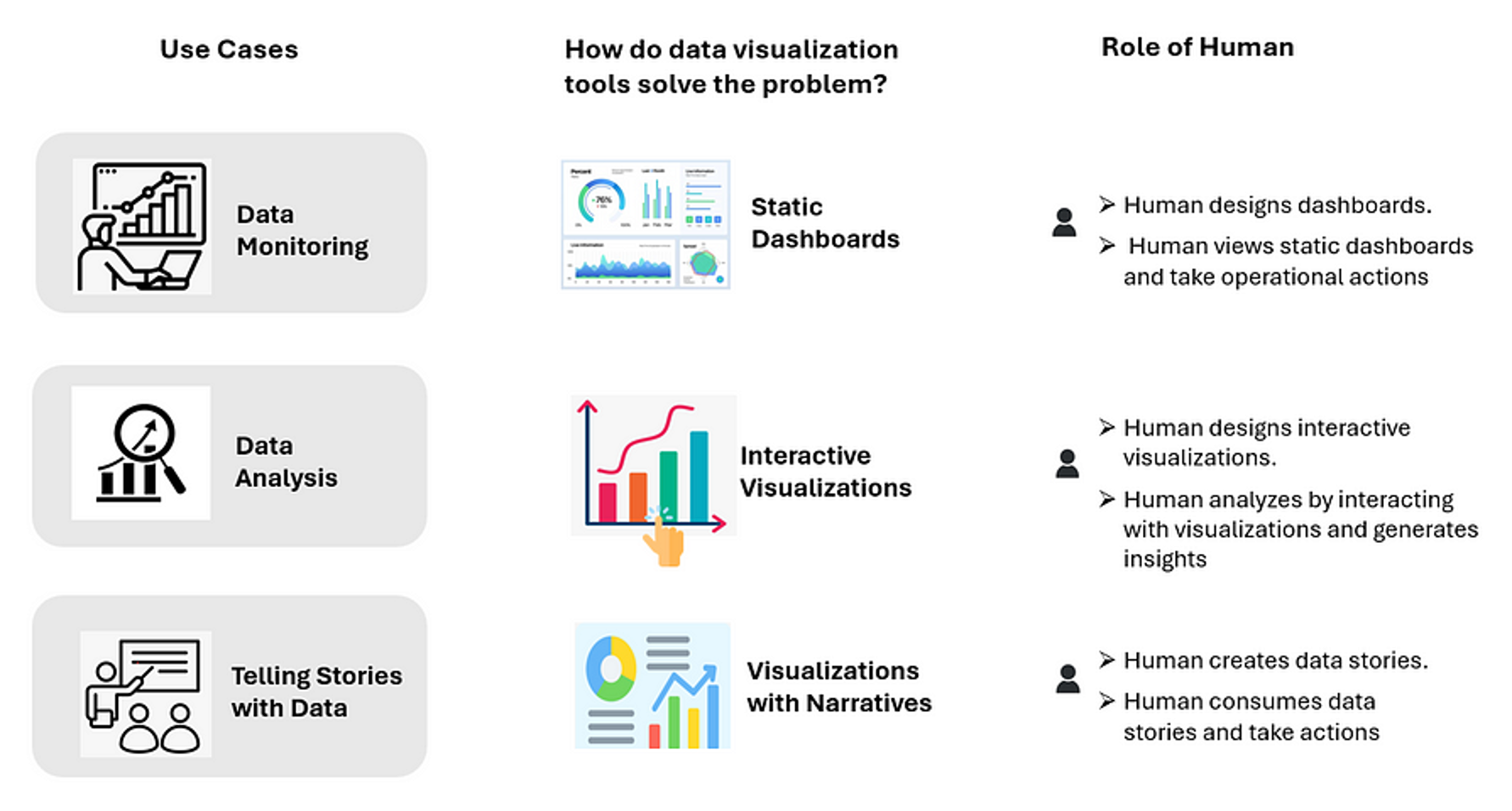The illustration below summarizes how data visualization tools currently solve data visualization use cases and the role of humans in the process.