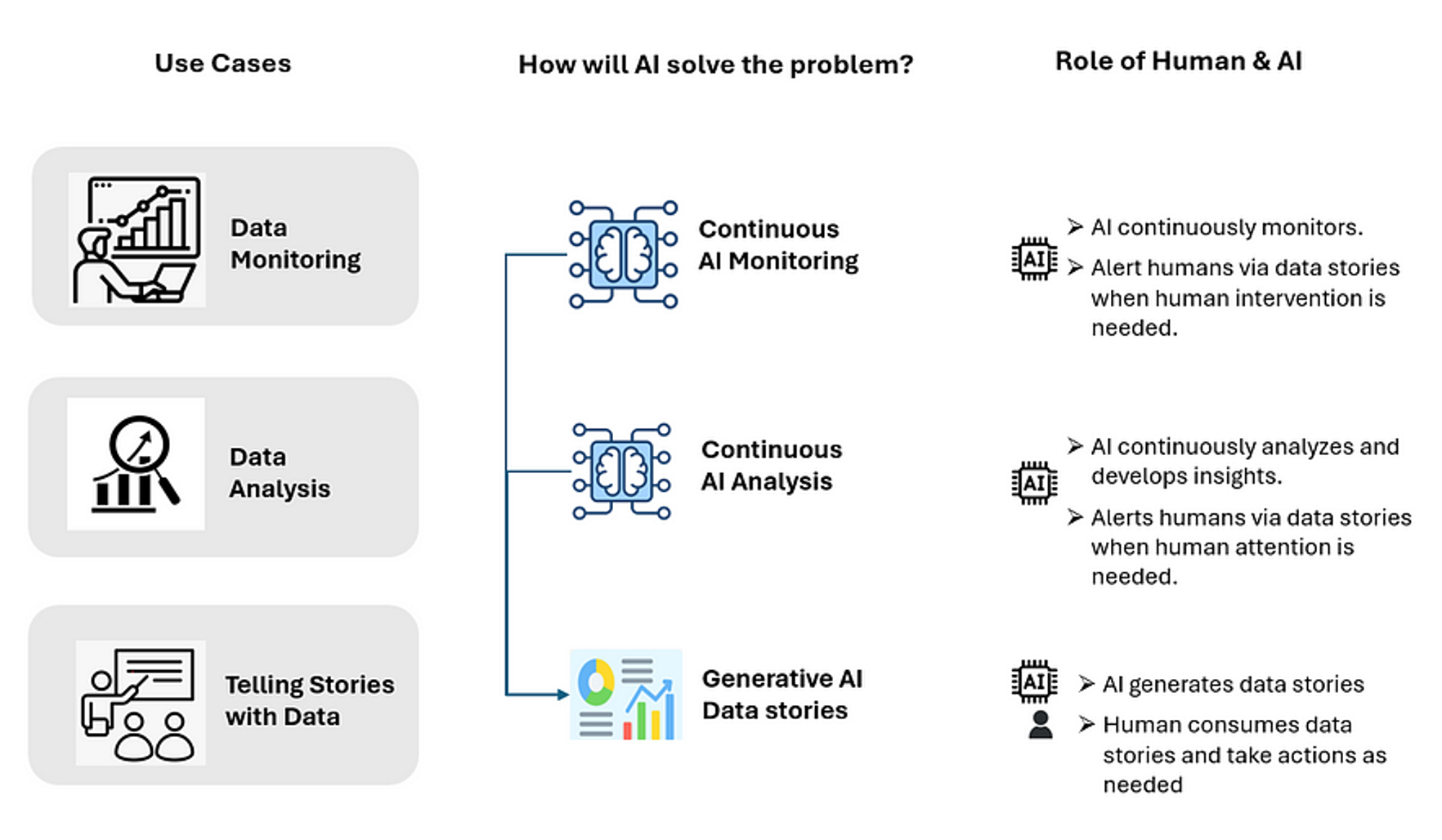 AI should not just be able to continuously analyze but also communicate that analysis to business stakeholders via data stories. The challenge with AI-generated data stories is that there will be some noise along with the signal. In the future, when analysts are augmented by AI-generated data stories, their role will involve vetting the data stories and curating the stories that require business stakeholders’ attention. With improved training of AI models over time, the noise will be reduced, eventually allowing AI-generated insights to be directly presented to business stakeholders.