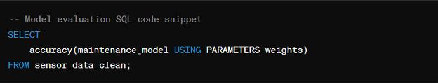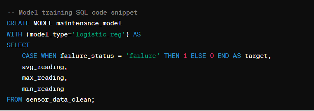 With the preprocessed data in hand, we can proceed to train a predictive maintenance model. Let’s say we choose to use a logistic regression model for this task: