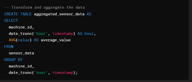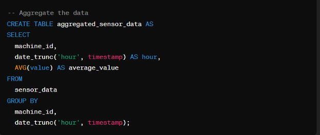 Aggregating the data allows us to summarize and condense information, making it easier to analyze trends and patterns. In this snippet, we aggregate sensor data by machine ID and hourly timestamp, calculating the average sensor value for each interval.