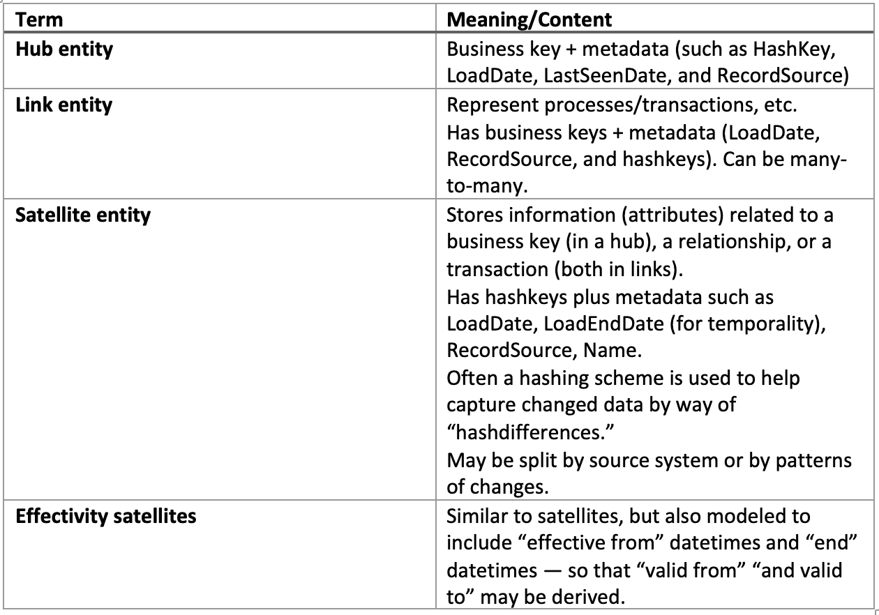 The data vault 2.0 book (referenced above) has a number of extensions to the terminology presented so far. Here follows a list of the most important ones together with an explanation, where necessary.