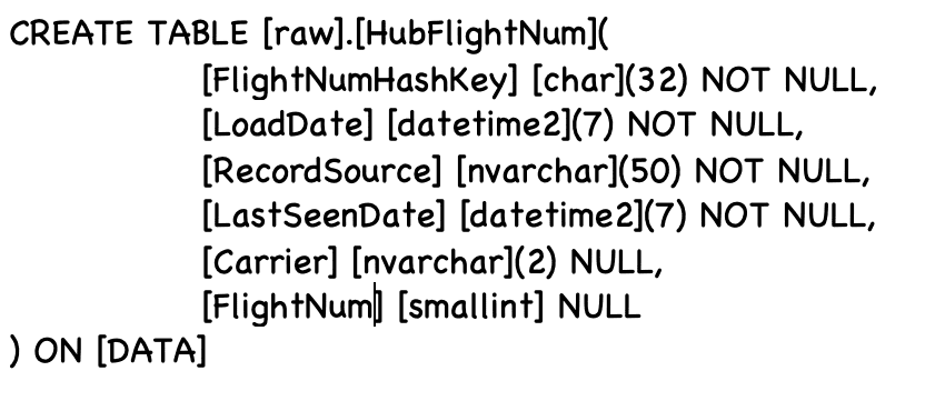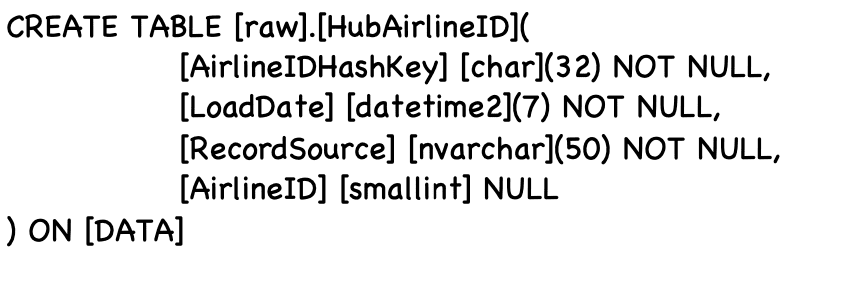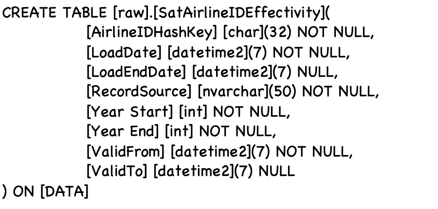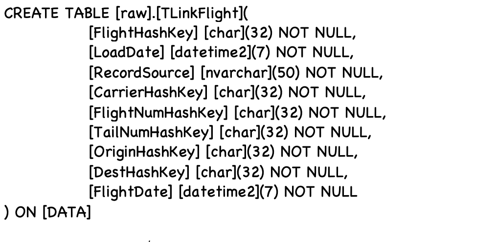 The data vault book we’ve referenced several times, Building a Scalable Data Warehouse with Data Vault 2.0, has an accompanying site where you can download a large collection of code. You will have to purchase the book to get access. I have handpicked a few examples of CREATE TABLE statements below to give you a flavor of the complexity of the table definitions in a data vault: