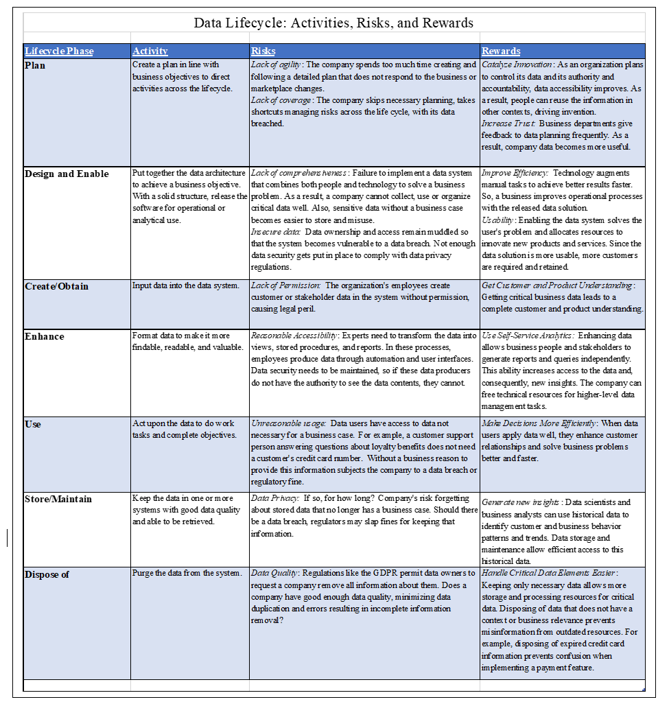 Like business products and services, business drives data activities that flow through an organization. Each step in the data lifecycle results in risks and rewards.