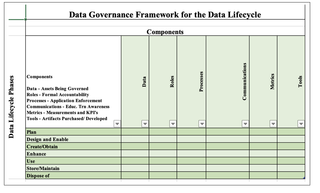Place this “Data Governance Framework for the Data Lifecycle” matrix next to the “Data Lifecycle: Activities, Risks, and Rewards” matrix. By doing so, data managers and their teams can start to develop Data Governance services.