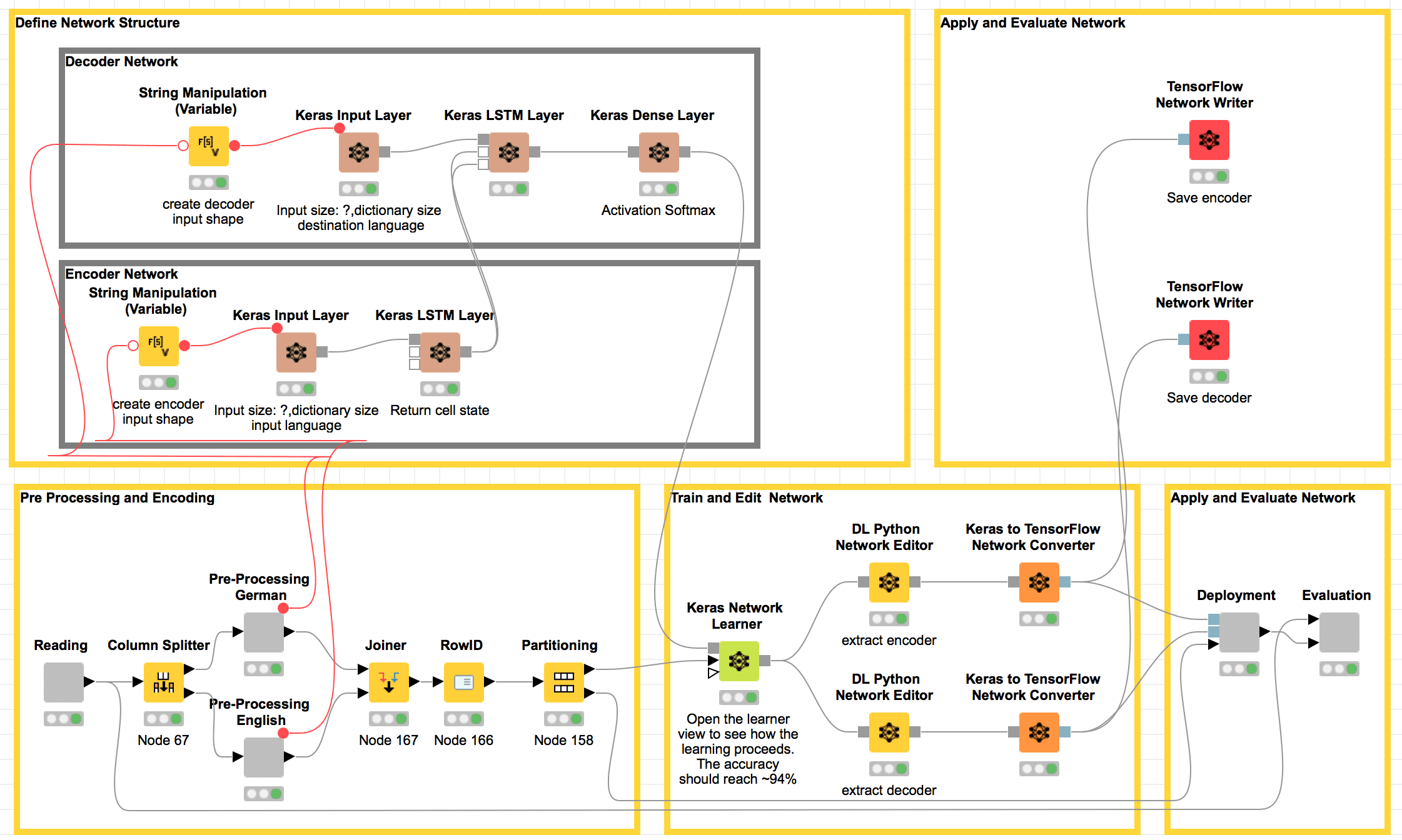 Figure 6. Workflow to build, train and evaluate a neural network for automatic translation from English to German. In the top left frame, the brown nodes each add one layer to the neural network for the training phase: an input layer and an LSTM layer for the English (encoder) and German (decoder) text, respectively, and one dense layer to produce character probabilities at the end. The frame under the network construction nodes transforms the English and German texts into index-based encoding sequences. Still in the lower part, nodes in the central frame train the whole network and then split it into encoder and decoder via DL Python Network Editor nodes. Finally, Deployment and Evaluation nodes apply the network to the test set and evaluate the translation results.