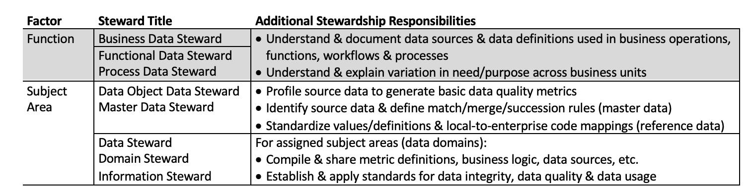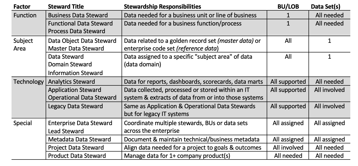 The variety of data steward titles seem to revolve four key factors that determine which data they help manage: