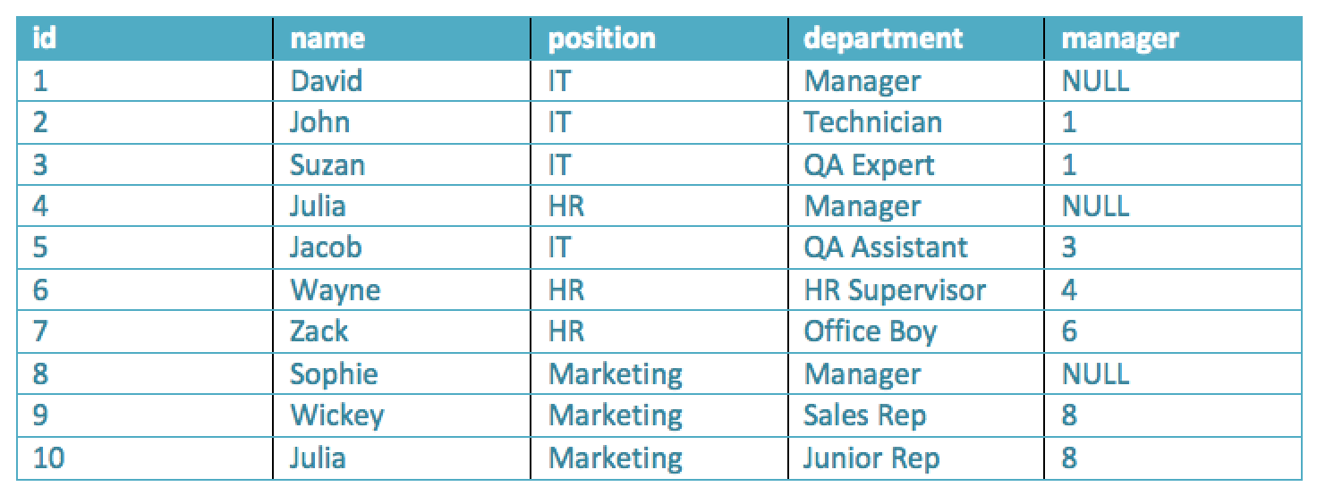 The below Employee table has five columns: id, name, department, position, and manager. The rationale behind this table design is that an employee can be managed by none or one person who is also the employee of the organization. Therefore, we have a manager column in the table which contains the value from the id column of the same table. This results in a hierarchical data where the parent of a record in a table exists in the same table.