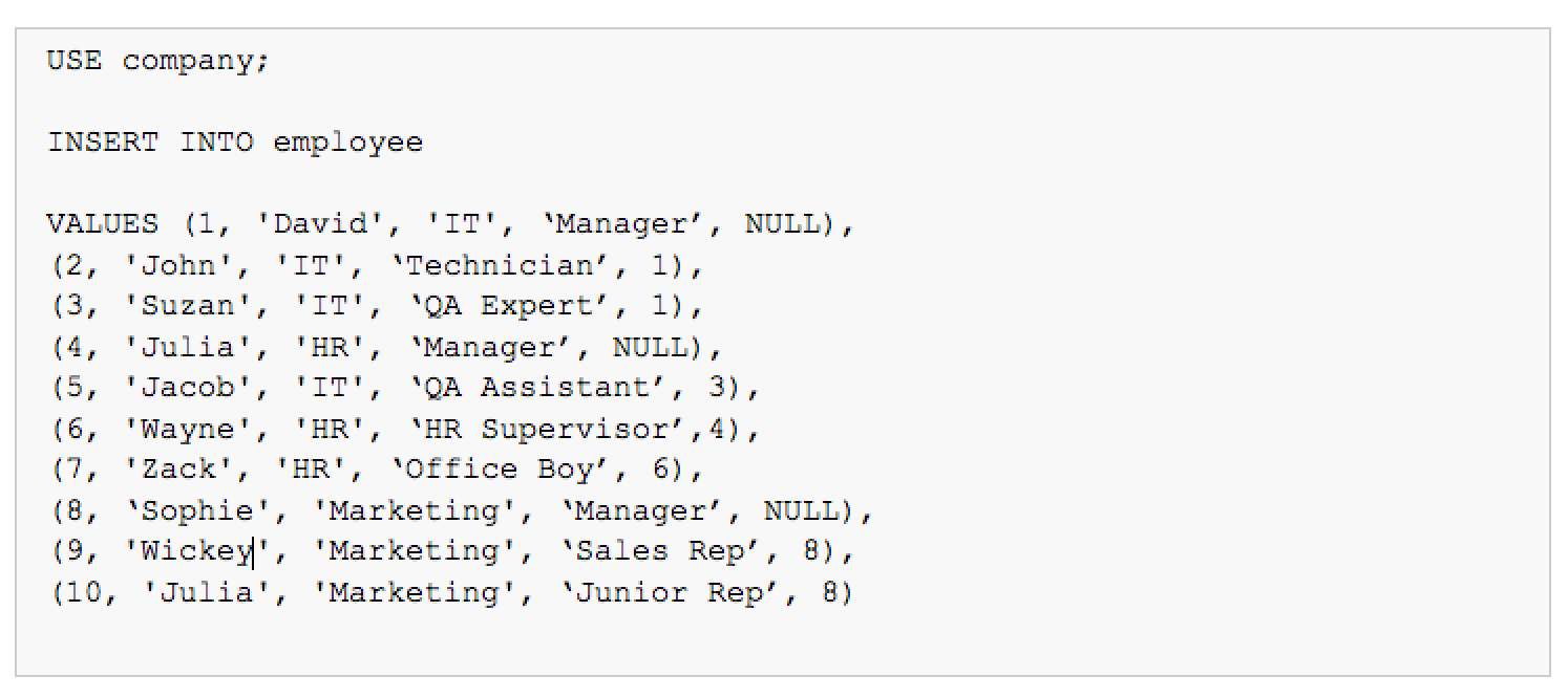Finally, let us add some dummy data that we saw earlier in the employee table so that we can create CTE and execute recursive queries on the data. Always be sure that your backup is working before trying something new on a live database.