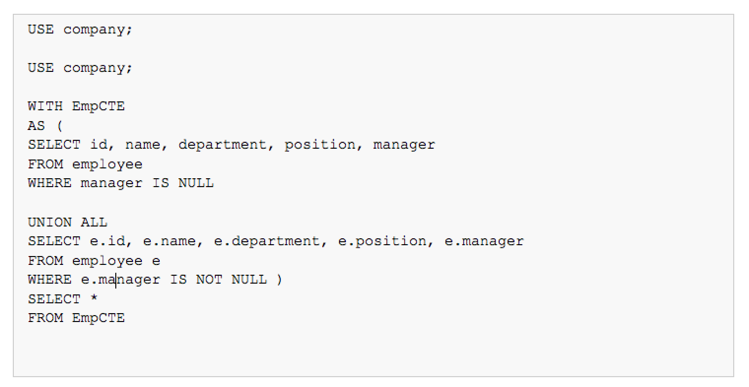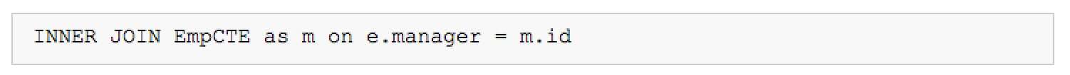 Next, we added an INNER JOIN in the recursive query which binds the results of the anchor query to the recursive query. The recursive query iterates over each record retrieved by the anchor query and finds the records of the subordinates. This is achieved by the following INNER JOIN:
