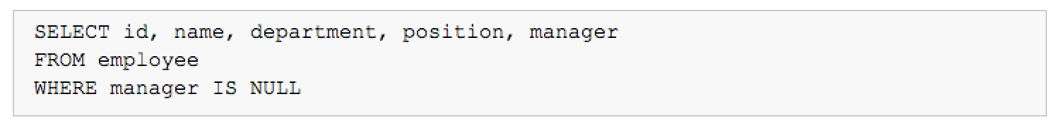 Firstly, records of all the employees with manager id “Null” are being retrieved. These are the employees who do not have any bosses over them. The following query performs this task: