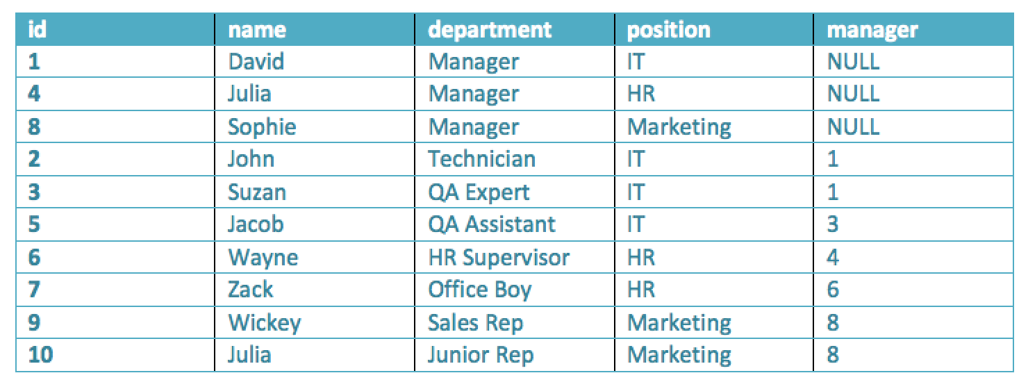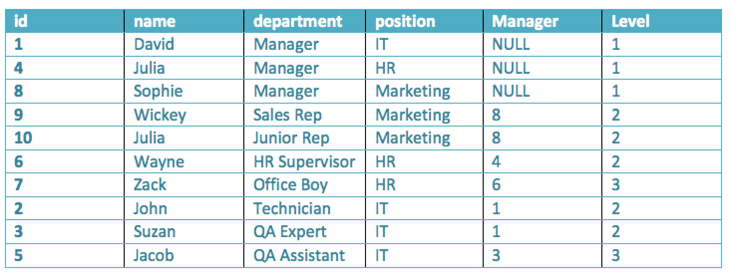 From the Employee table, it can be seen that IT department has a manager David with id 1. David is the manager of Suzan and John since both of them have 1 in their manager column. Suzan further manages Jacob in the same IT department. Julia is the manager of the HR department. She has no manager but she manages Wayne who is an HR supervisor. Wayne manages the office boy Zack. Finally we have Sophie, who manages the Marketing department and she has two subordinates, Wickey and Julia.