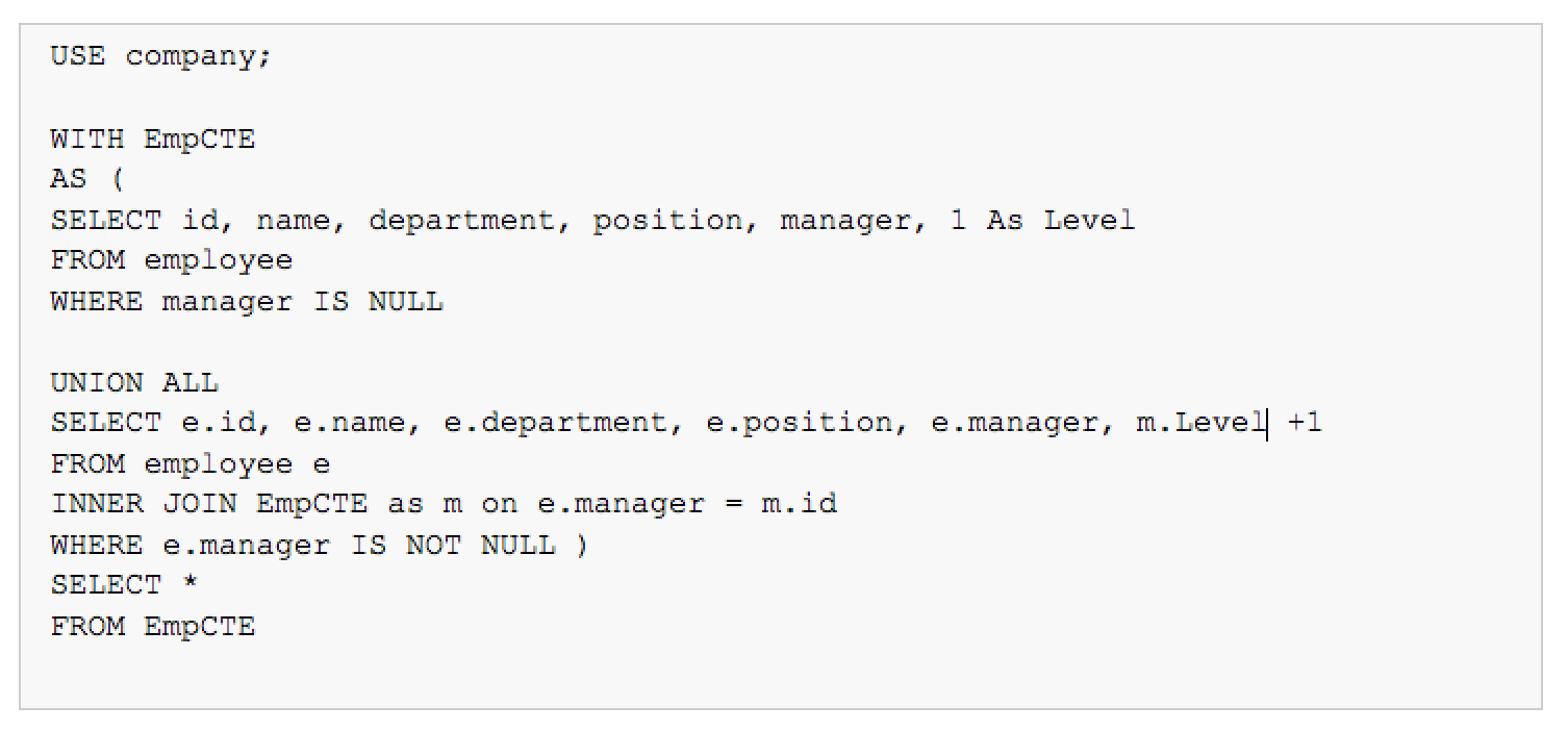 In the anchor query, we added a line “1 As Level”. This adds a Level column to the CTE. We set level as 1 because we know that the level of all the employees with Null id for manager column is 1.