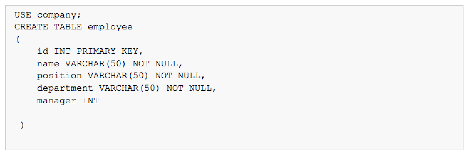 Next, we need to create “employee” table within the “company” database. The employee table will have five columns: id, name, position, department, and manager. Remember this is not a perfectly normalized data table. At the moment we just want to see CTE and recursive queries in action. To create a company table, execute the following query:
