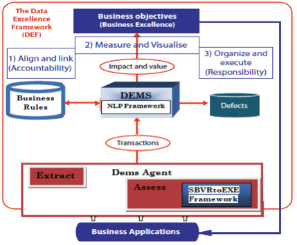 The DEF describes the methodology, processes and roles required to generate business value while improving business processes using data quality and BR [6]. DEF is supported by the DEMS platform shown in Fig.1. However, the complexity of the description of the BR due to ambiguities of NL can induce a deviation in the operationalization of the DEF. In the current context, the BR is manually read, disambiguated and converted to DEMS Agent BR format for further operations. The set of BR supporting data quality grows over time and the amount of manual processing becomes huge and time consuming. Thus, our framework supports the DEF with a fully automated process of transforming NL BR to SBVR BR in DEMS (NLP Framework), and afterwards, SBVR BR to Executable BR in DEMS Agent (SBVRtoEXE Framework).