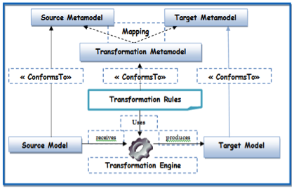 MDA is an OMG standard [5] constituting the core standard of Model Driven Development (MDD). It defines an approach that separates business and application logic from underlying platform technology (e.g. CORBA, J2EE, .NET). No longer tied to each other, the business and technical aspects of an application can each evolve at their own pace, business logic responding to business needs and technologies taking advantage of new developments. MDA is focused on two artifacts: models and model transformations. Its key principle is to elaborate models at any stage of the application development process and to move from one stage to another by model transformations as in [9]. Model transformation is the main key constituent of the MDA approach. A transformation is the automatic generation of a target model from a source model, according to a transformation definition. A transformation definition is a set of transformation rules that together describe how a model in the source language can be transformed into a model in the target language. A transformation rule is a description of how one or more constructs in the source language can be transformed into one or more constructs in the target language [10]. There are currently three approaches to model transformations: transformation based programming, design patterns, and modeling. Our methodology uses transformation based modeling presented in Fig. 2 which is strongly recommended by the MDA approach and is defined in three steps: transformation rule definitions, expression of transformation rules, and the execution of transformation rules by the transformation engine. This takes as input the source model, applies the transformation rules, and produces the target model. The relation between a model and its metamodel is called “ConformsTo”.