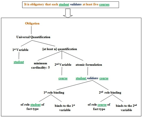 The example of BR “A student must validate at least five courses.” has been used throughout the paper to illustrate the methodology. Although it seems relatively simple, it embeds important concepts both from the language and modeling viewpoint. However, the framework also supports some complex description of BR written even in several sentences as well. In this case, we first proceed to the identification of sentences representing a SBVR BR by using modal and logical keywords. Afterwards, each rule sentence can be analyzed in the same way as the above example.