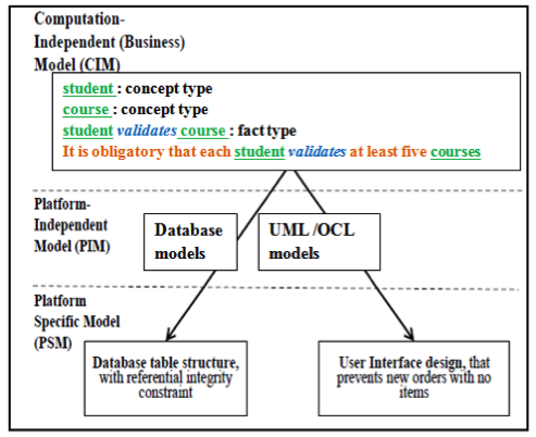In reality, SBVR describes BR without addressing their implementation, e.g. an obligation rule specifies what a business must do, possibly under some conditions, without saying how the business should do it. This stage of our methodology allows ensuring that the SBVR BR conforms to SBVR metamodel in order to map to an executable model (PIM level) for further code generation (PSM layer). An MDA model transformation described in section II is applied. An advantage is that one rule can map to multiple implementation artifacts [17], as shown in Fig. 5.; e.g. our SSE rule “It is obligatory that each student validates at least five courses” implies a database table structure with a foreign-key reference among student and courses, and the application that supports the constraint at least five courses per student.