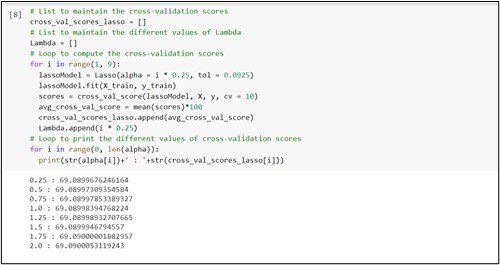 Step 7: The same thing follows for implementing Lasso regularization in our model. First we have to calculate the cross_val_score, then build and fit the model, and finally, evaluate our model.
