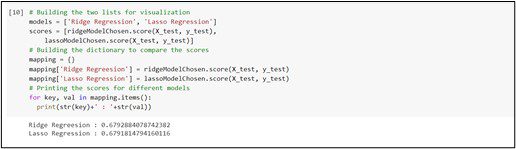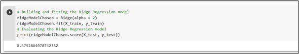 Step 6: Now, we are ready to build and fit our Regression Models starting with Ridge regularization at the foremost. print(ridgeModelChosen.score(X_test, y_test) will evaluate the model accordingly.