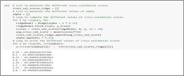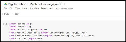 Step 1: The first and foremost step is to import the necessary libraries, which include pandas, numpy, matplotlib, sklearn.linear_model, sklearn.model_selection, and finally mean from statistics library. The train_test_split and cross_val_score are imported from the sklearn.model_selection library. The Ridge regularization coefficients minimize a penalized residual sum of squares whereas the Lasso is a linear model that estimates sparse coefficients.