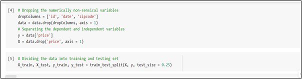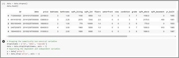 Every dataset consists of some columns that are irrelevant or nonsensical and can be omitted. The same case applies as we shall be dropping the “id, date, zipcode” columns from our dataset. Now, it’s time to separate the dependent and independent variables. The below code snippet will make you understand it in a much better way.