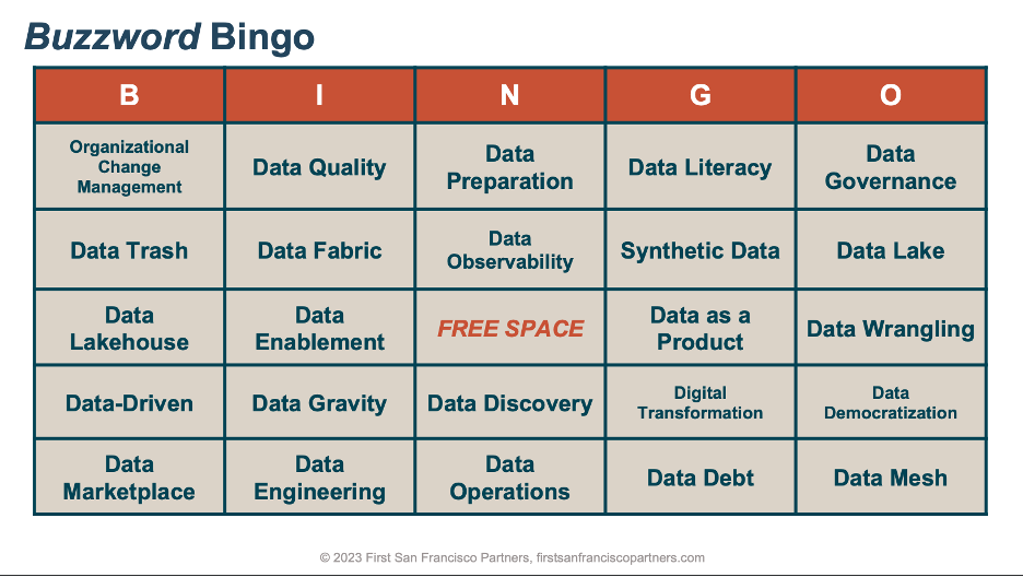 So, organizations need to ensure alignment and a consistent understanding of data concepts. This shared knowledge comes in handy when discussing Data Architecture, Data Quality, and data enablement, fundamental data transformation components. O’Neal spent an EDW session gathering and clarifying the underlying data concepts to help make discussions more straightforward. See the bingo sheet to review and refer to the terminology in this article.