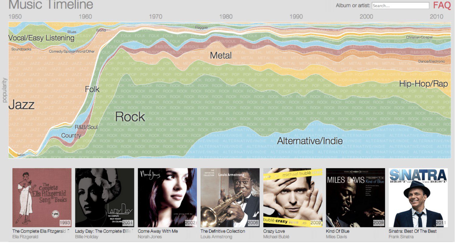 According to DAMA-DMBoK2, data visualizations cover traditional BI tools like “tables, pie charts, line charts, area charts, bar charts, histograms, turnkey box (candlestick).” Users may access data visualization in a static format, like a report or a more interactive online form, like a that they can drill down. Google Research’s Music Timeline is an example of an online data visualization.