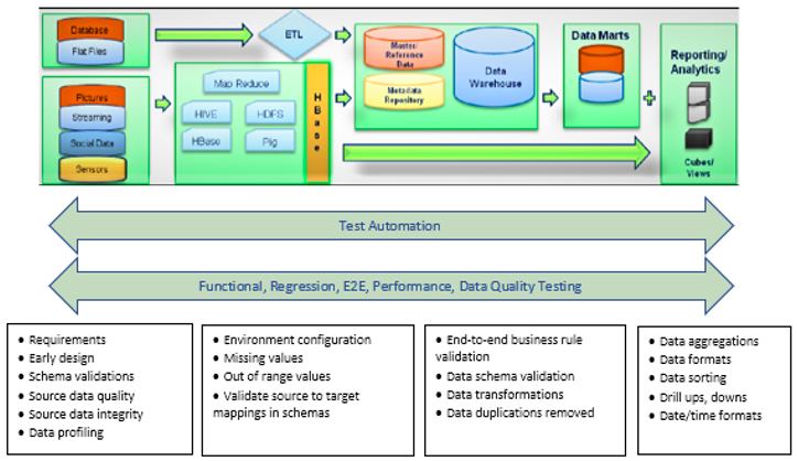 - End-to-end testing: Data testing can take time, mainly due to the multiple steps, technologies, and large volume of data involved. Each stage of the ETL tests requires various tools, strategies, and types of tests. These include individual comparisons, migrated data validations, data transformation rule validations, reconciliations – from sources to targets – Data Quality verification, and preliminary testing of client information reports.