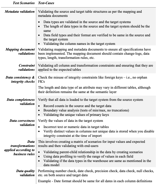Table 1: Test scenarios and test cases frequently considered for automated ETL testing