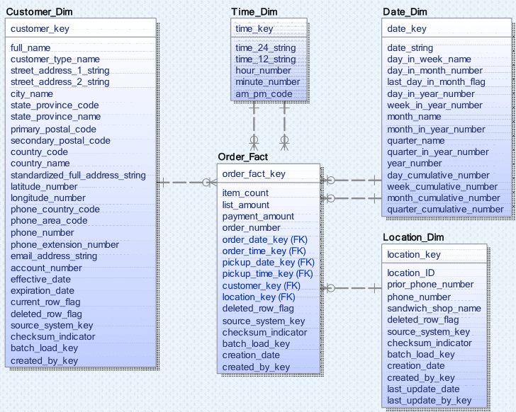 - Join logic. All the relationships are to mandatory dimensions, so we will not accidentally drop any records. Typically, all data warehouse dimensions are mandatory. Dimensions have special records for “not known” or “not applicable”. However in prototyping, we sometimes access source operational data and there we sometimes encounter optional relationships that can cause inadvertent dropping of records.