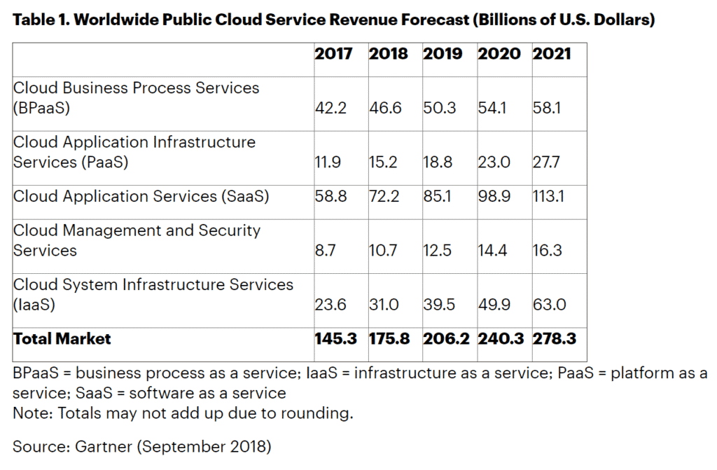 Before we dive into optimization, let’s take a look at how the cloud market continues to grow in 2019 and beyond. Gartner estimates that $206B will spent on public cloud services in 2019, up 17% from 2018 as outlined in the table below: