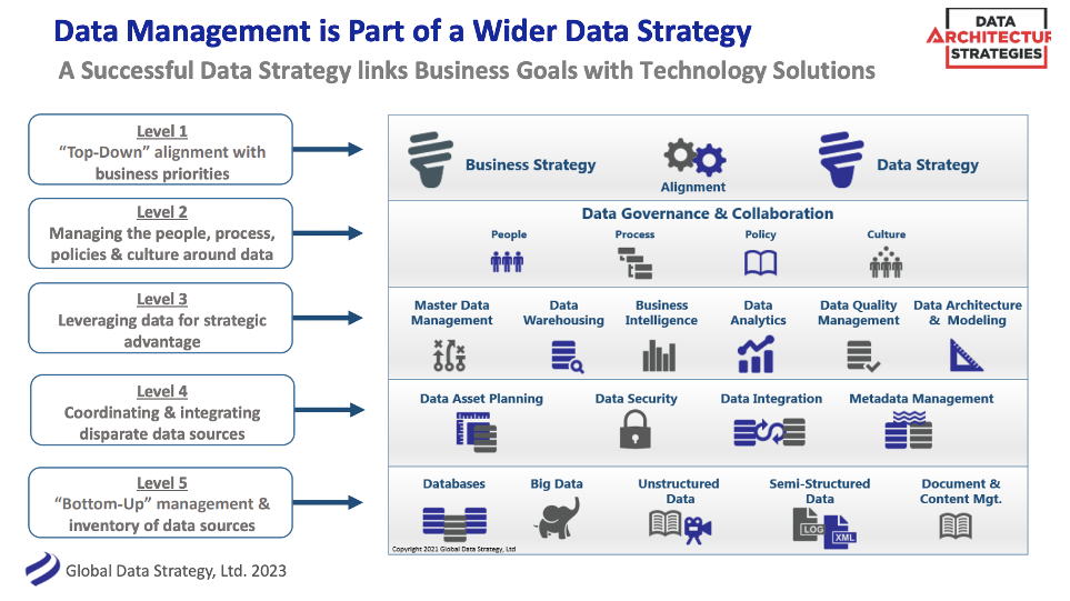 Put the diagram above, showing Data Management activities across five levels, in front of executives and you’ll receive glassy-eyed looks. As Burbank explained, “It is not that managers do not care about Data Management; they probably don’t understand what it means to be data-driven.” Such a diagram goes over their heads.