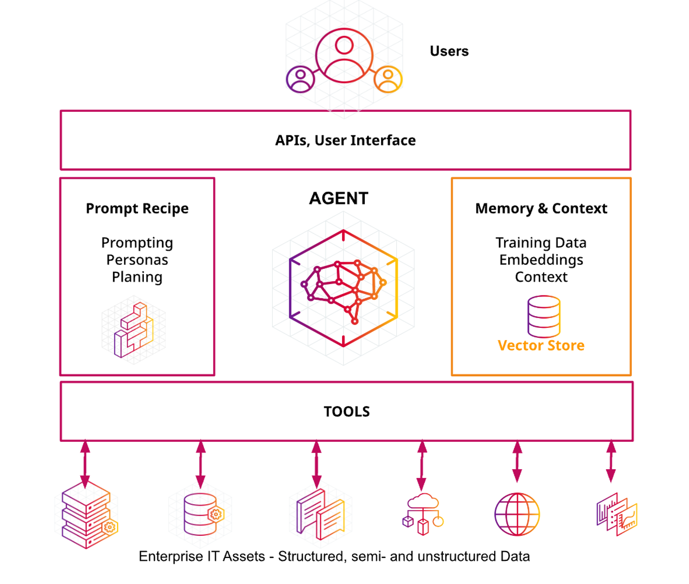 From a technology perspective, there are five elements that go into autonomous agent designs: the agent itself, for processing; tools, for interaction; prompt recipes, for prompting and planning; memory and context, for training and storing data; and APIs / user interfaces, for interaction.