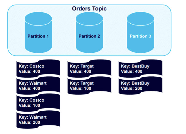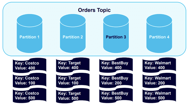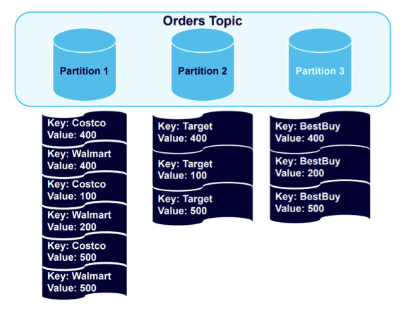 All Costco or Walmart records go in Partition 1, and all Target or Best Buy records go in Partition 2. The records are in the order that they were sent to those partitions.