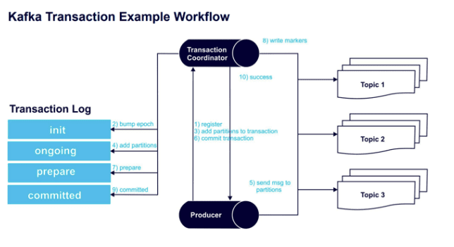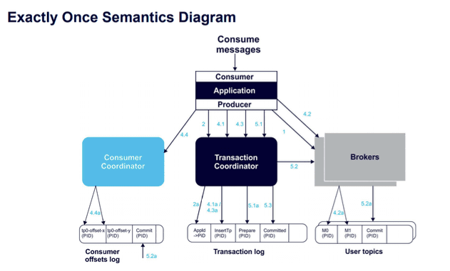 The following diagram captures the Kafka transaction workflow steps needed to achieve Exactly-Once Message Delivery.