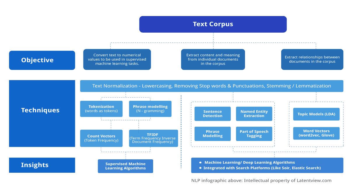 Karthikeyan Sankaran: The question that NLP tries to answer is: “Given a large corpus of text, what steps are to be carried out to generate insights and meaning?” There are a wide range of techniques LatentView uses: