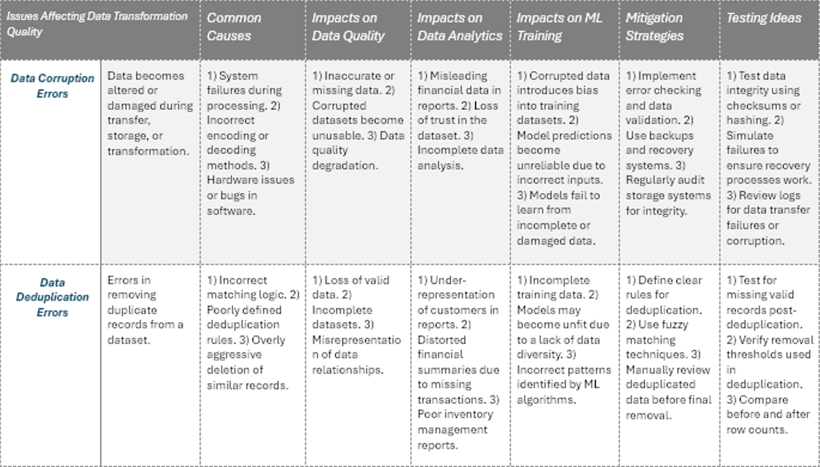 The following graphic is an excerpt from a file containing more than 50 issues that have a potential for causing data quality issues. To study the entire file, click here: Data Transformation Issues and Ideas for Mitigations.
