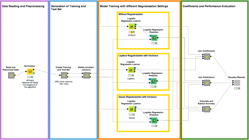 Figure 1. In this workflow we first read the advertisement dataset, normalize the input features, create a training subset with 120 samples and 680 features, and train three logistic regression models with different prior settings. In the last step we join and visualize the results.